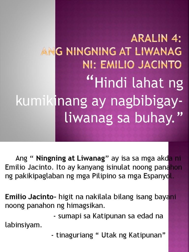 Ang tunay na pag-ibig marahil ay isang bagay na nakapagbibigay-liwanag sa buhay. Sa tingin ko dapat nating mas pagtuonan ng pansin ang mga bagay na maningning sa ating buhay. Madaling silawin ang ating paningin ng mga bagay na kumikinang na para bang kutitap ng bituin pero lagi mo tatandaan na hindi lahat ng kumikinang ay ginto.